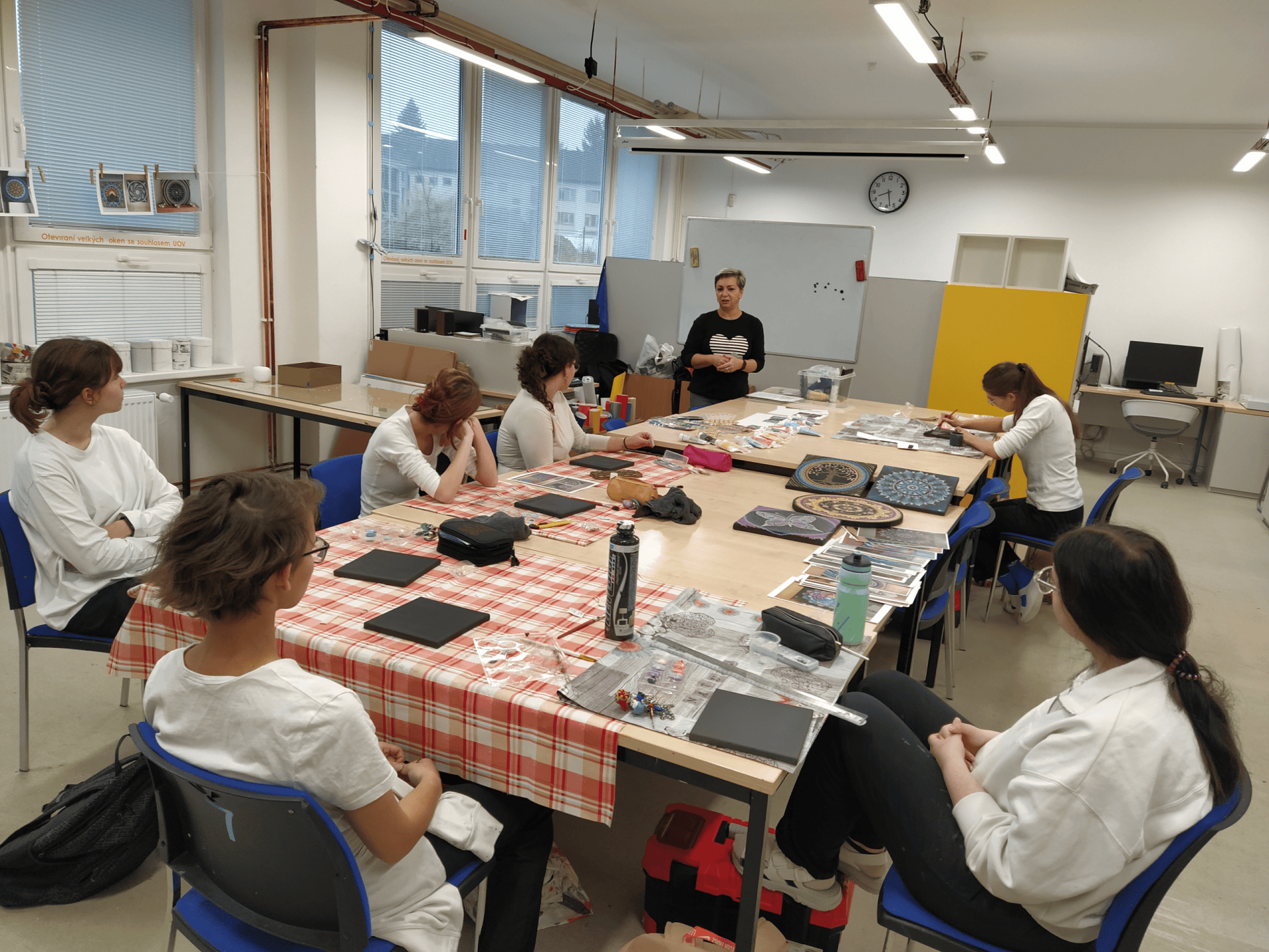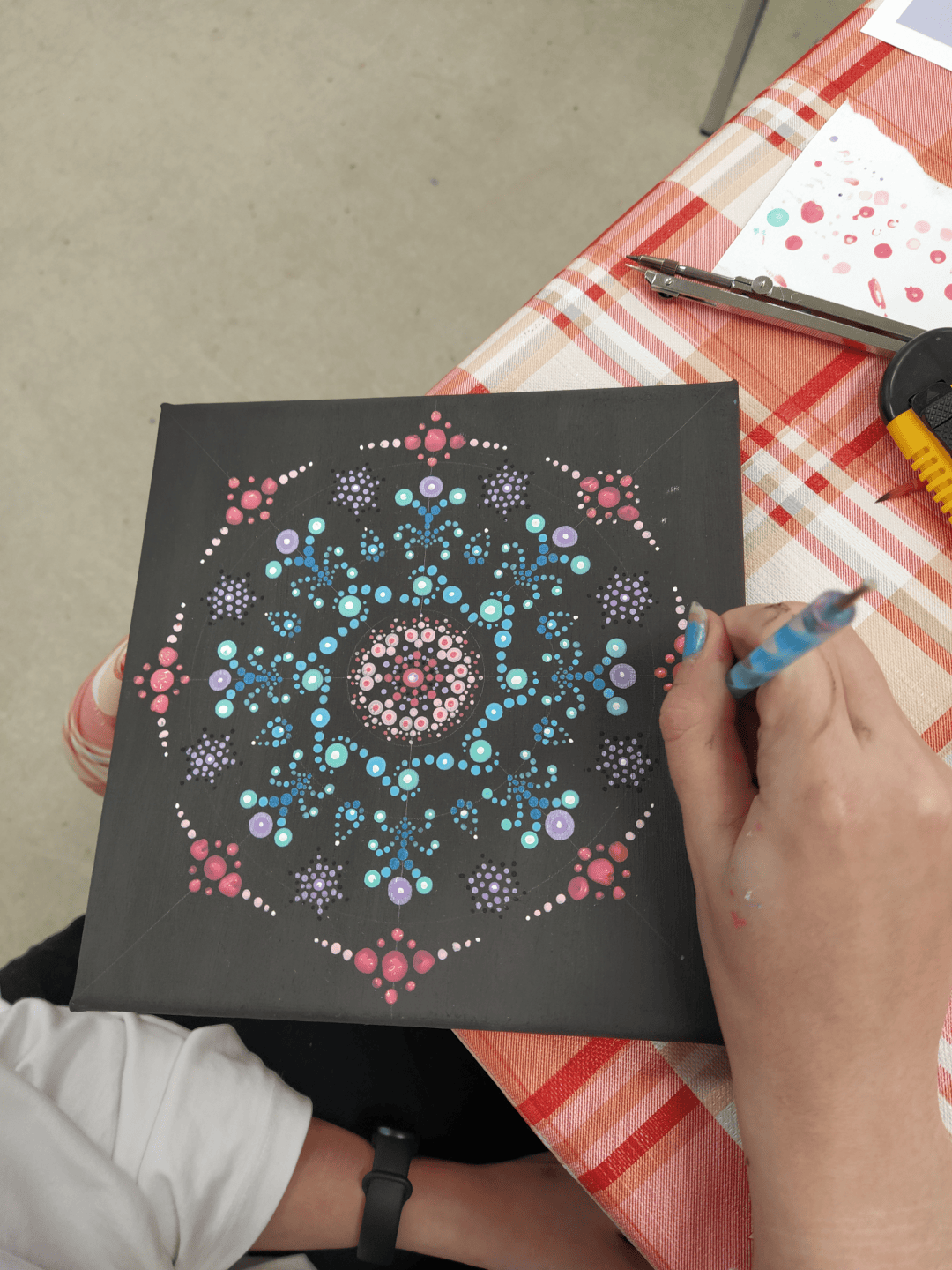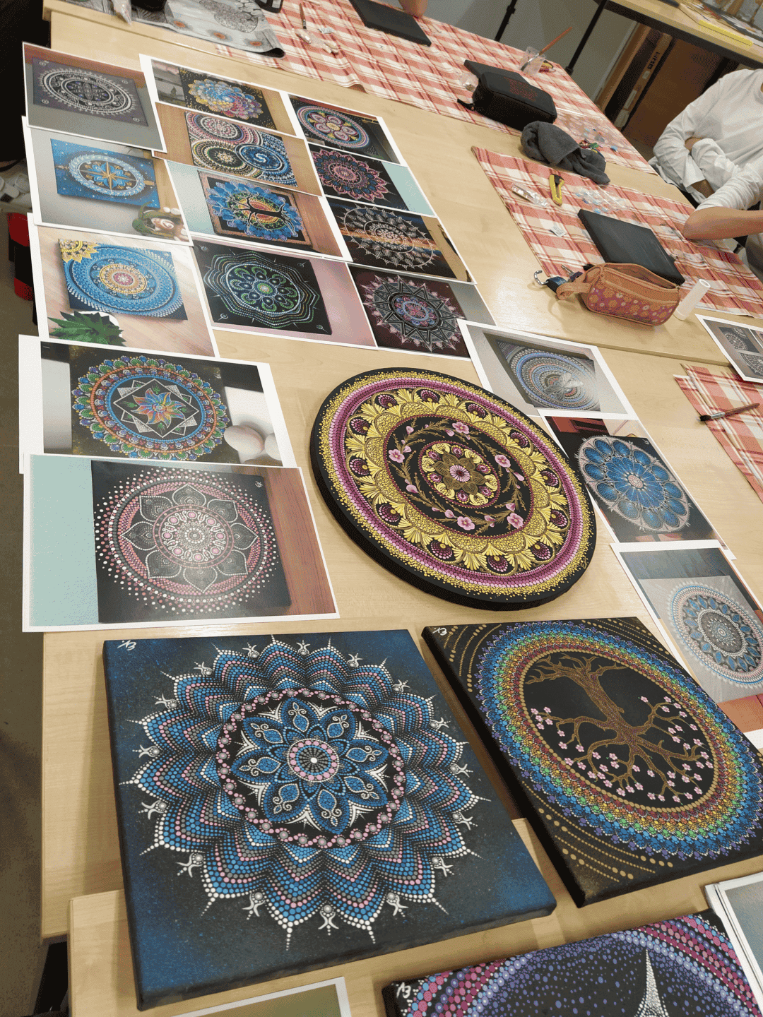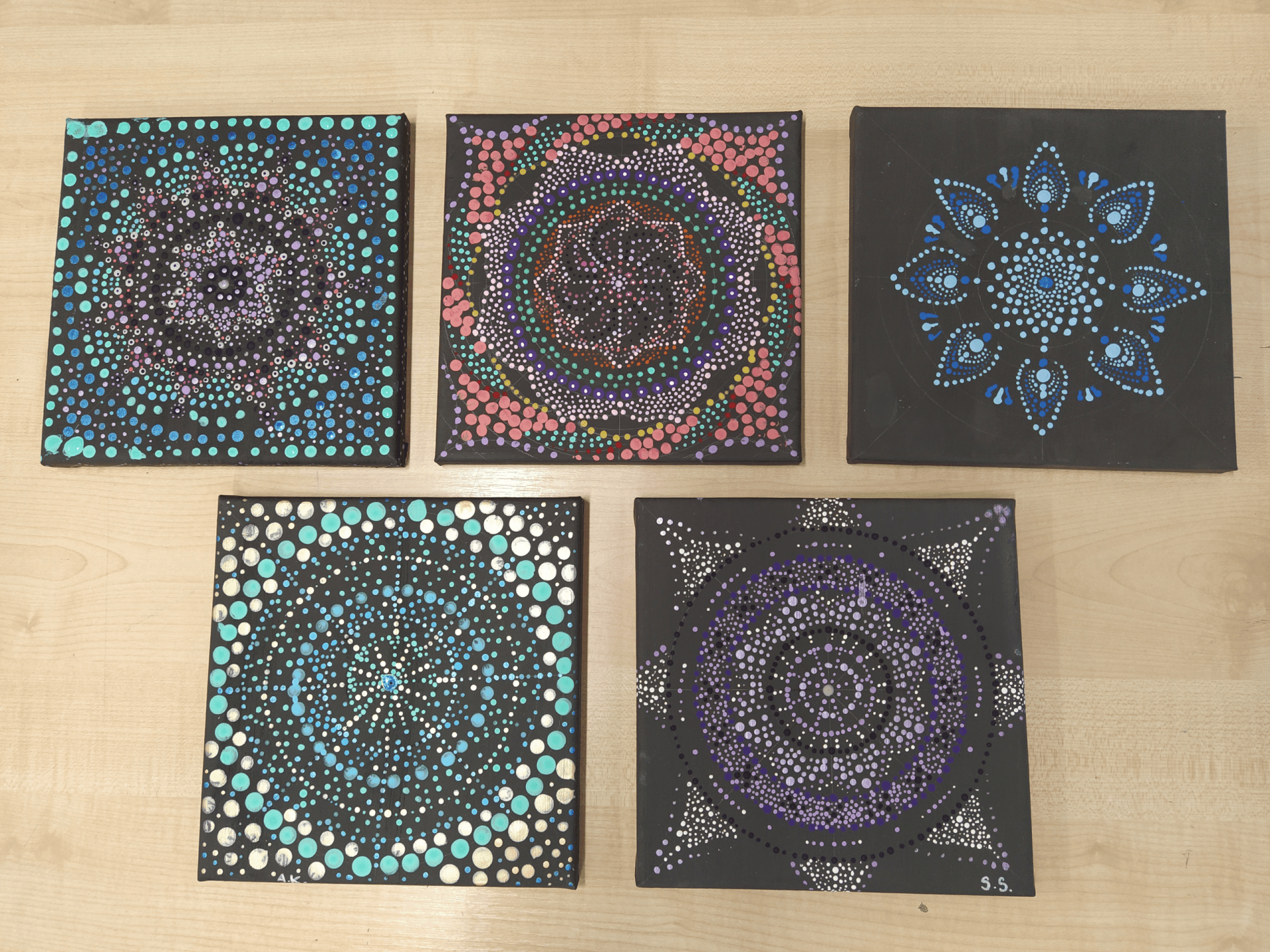 Skupinka děvčat oboru Aranžér z 1.D absolvovala kurz Mandal. Tento kurz je na naší škole již tradiční a poskytuje techniku, která je nenáročná a přitom zajímavá. Pomáhá uvolňování stresu a hotový obraz může působit na člověka pozitivně i dlouhou dobu. Malovali jsme na menší plátno pomocí barvy a různě velkých teček. Předlohou nám byly obrazy od paní Večeřové, která se touto technikou zabývá ve svém volném čase. Děvčata byla šikovná a jistě se k této technice budou ráda vracet. Posuďte sami, jak jim to šlo.